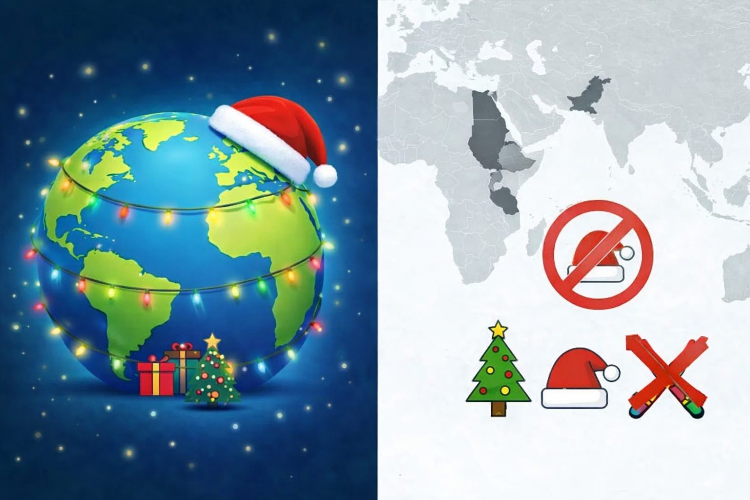 ब्रुनेई में क्रिसमस के सार्वजनिक उत्सव पर सख्त पाबंदी है। यहां शरिया कानून के तहत सार्वजनिक रूप से क्रिसमस ट्री, रोशनी, यीशु की फोटो या सांता क्लॉज की टोपी दिखाना गैरकानूनी है। हालांकि, गैर-मुसलमान अपने घर में निजी तौर पर यह त्योहार मना सकते हैं।